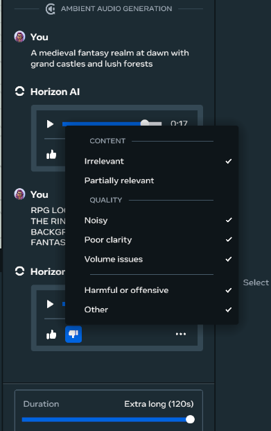 Make sure to play with the Duration parameter. If you are generating a nature sfx for example, you might get better results with shorter durations. These are the default examples: